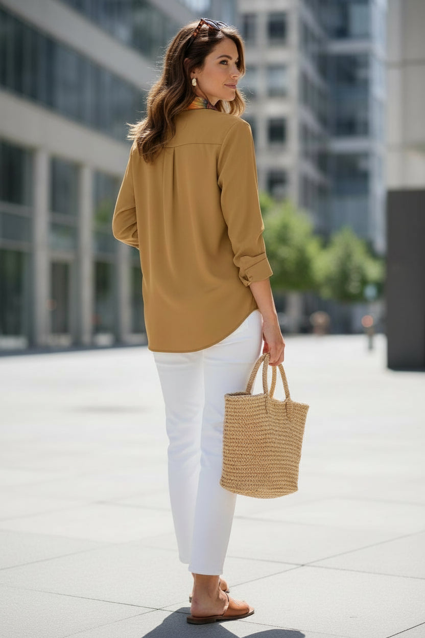 - Versatile Fit: A classic button-down silhouette that pairs perfectly with tailored trousers, leather leggings, or denim.
