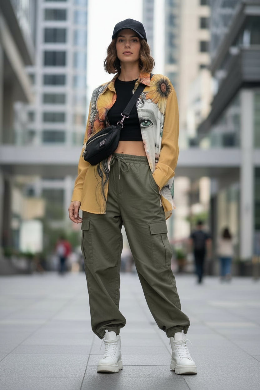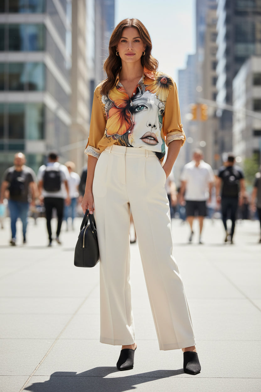 The vibrant ochre background serves as a canvas for a stunning, large-scale graphic of a woman’s face adorned with vibrant florals. Whether you’re heading to an art gallery, a boutique dinner, or a stylish brunch, this shirt ensures you stand out with effortless elegance.